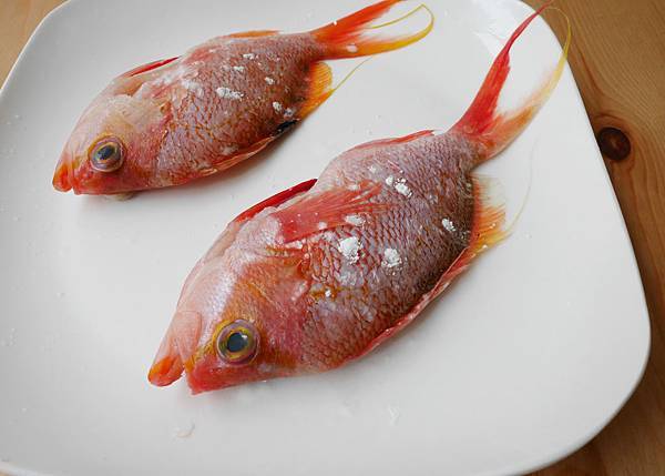2.魚擦乾水份,抹上鹽巴及拍上薄薄一層太白粉。