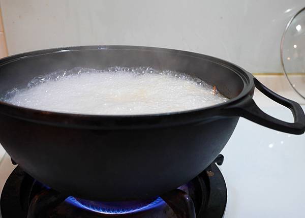 7.中大火開蓋煮8分鐘,湯慢慢變成奶白色。(要持續呈現很多泡泡在滾的狀態)
