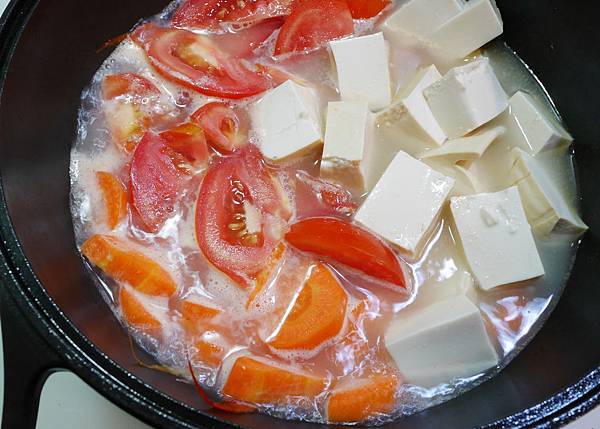 1.準備食材。番茄切塊,紅蘿蔔削皮切片,豆腐切1.5公分塊。