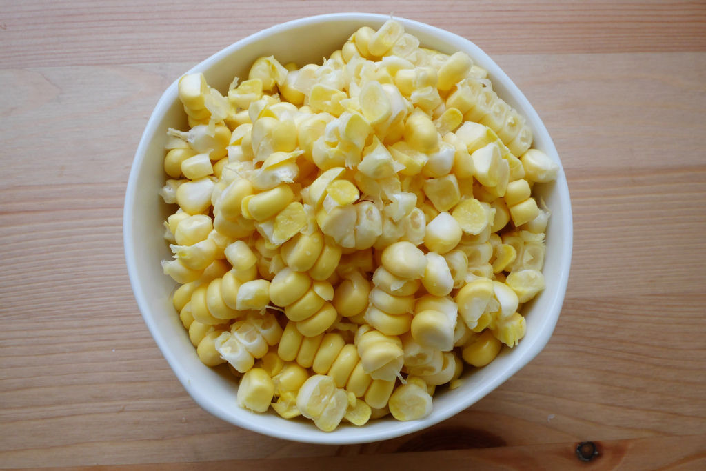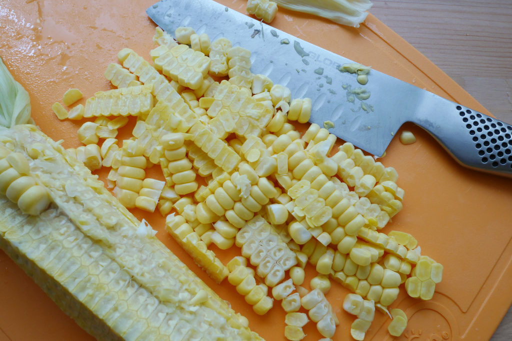 2. 將2條新鮮玉米的玉米粒切下來。直向沿著玉米粒的邊緣切便能完整取下玉米粒。