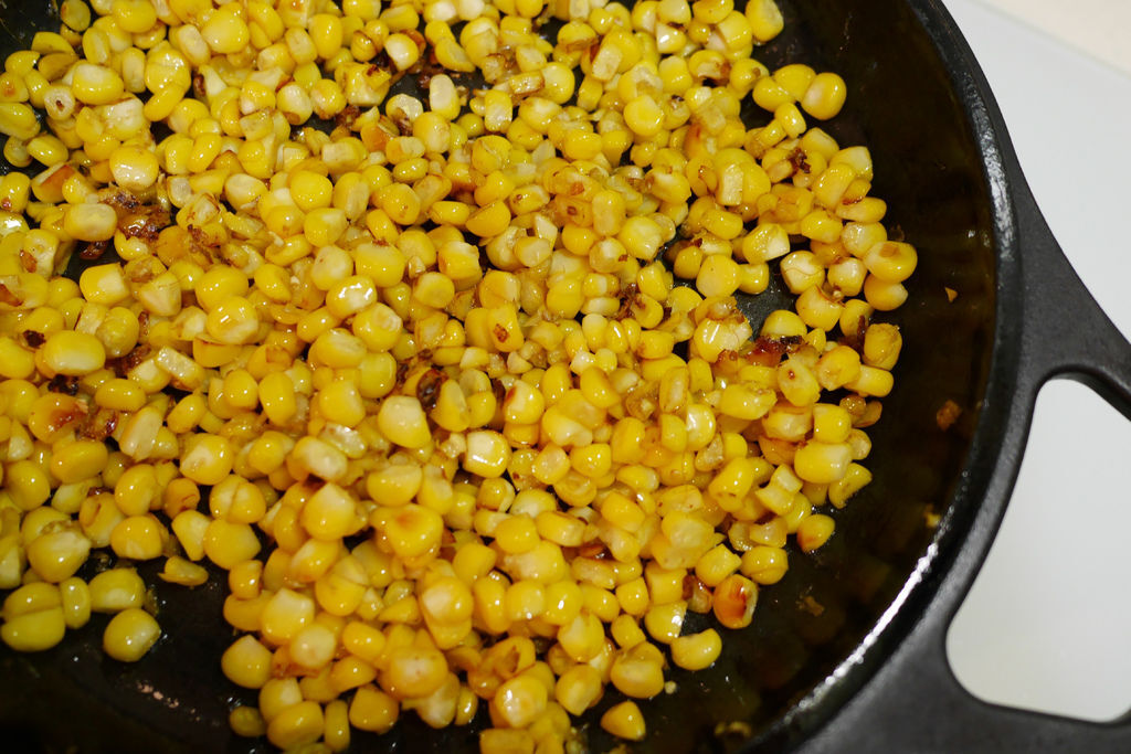 5. 大古22cm鑄鐵烤盤中火燒熱,轉小火,下玉米粒鋪平。