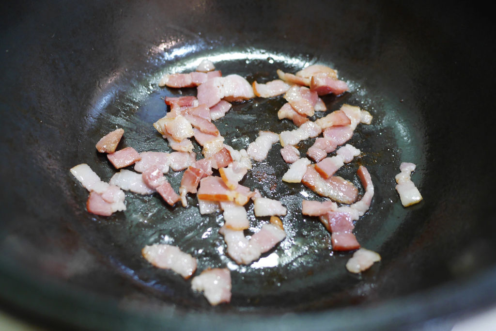 7. 鑄鐵湯鍋燒熱後轉小火,放入培根塊,炒至焦脆後取出培根。