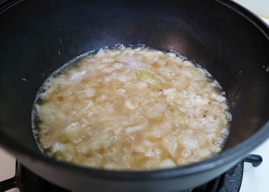 9. 利用湯鍋裡的培根油炒蒜末、紅蔥頭末及洋蔥丁,至洋蔥變軟。
