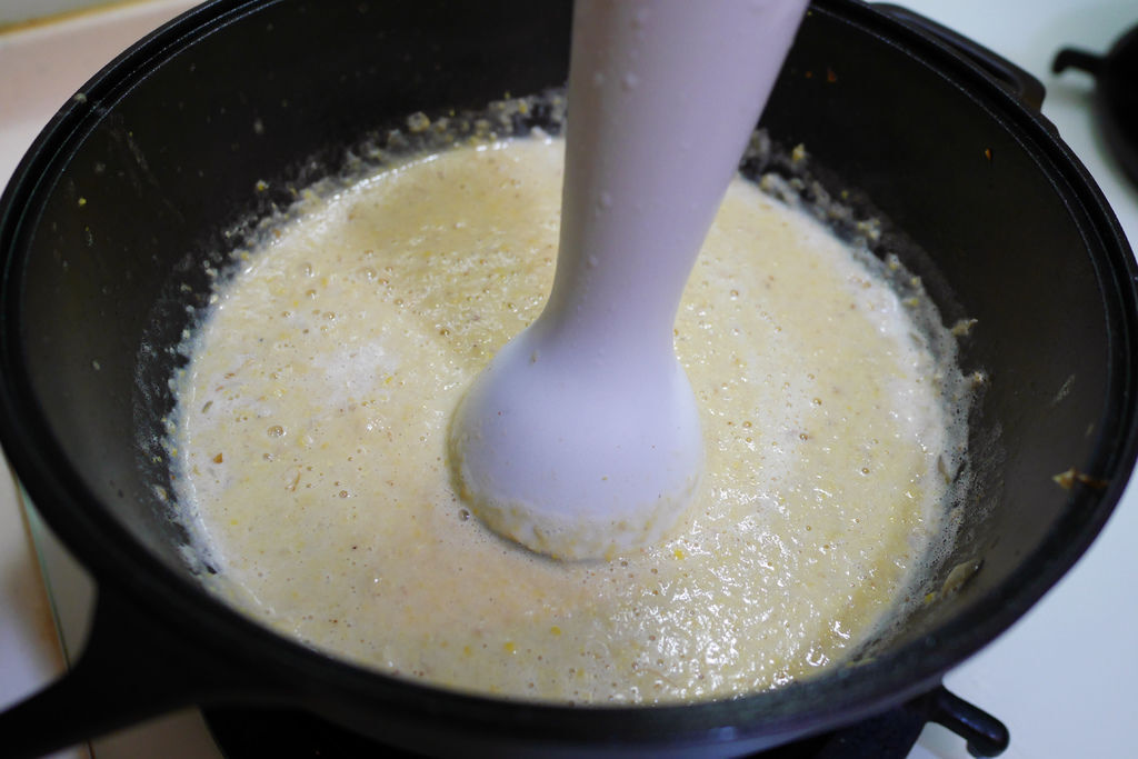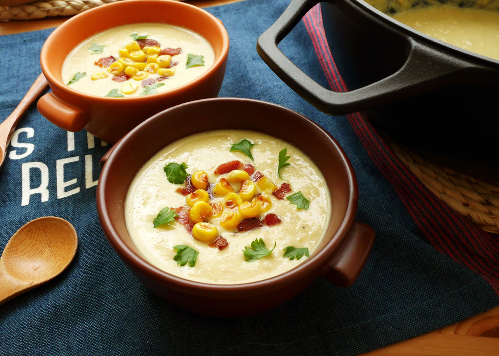 同樣道理放到煮濃湯,將玉米粒先烤至微焦,焦糖化的玉米粒不單甜味更濃縮,煮成湯後會散發出堅果香氣,這碗玉米濃湯真是前所未有的好喝!