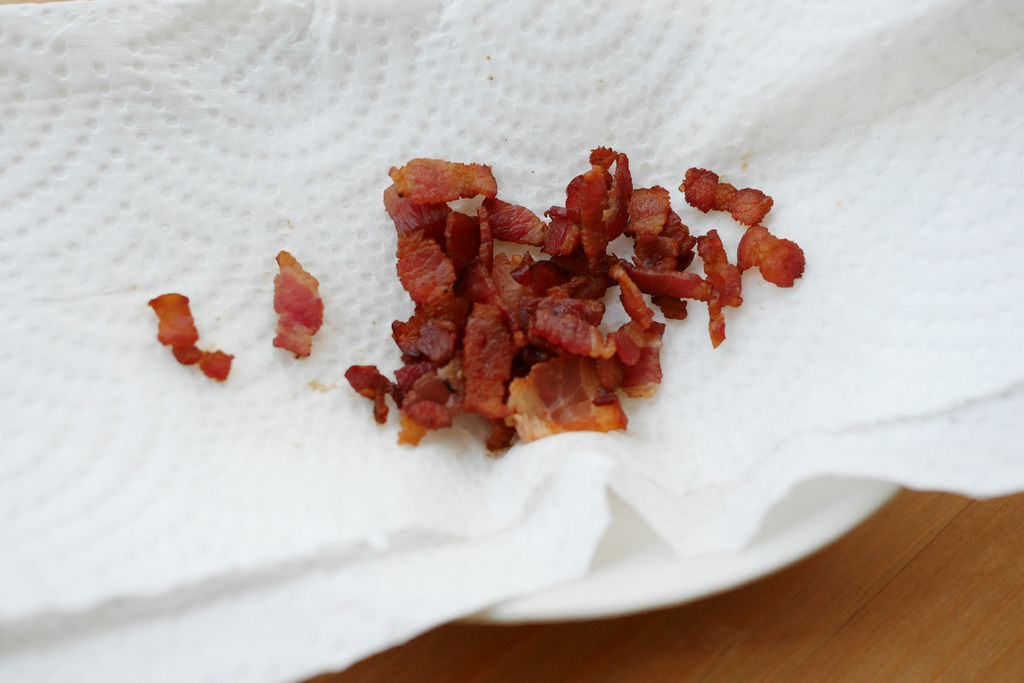 8. 將培根脆片放廚房紙巾吸油。